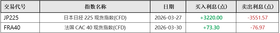 由于指数成分股的除息原因,以下指数CFD的过夜利息将会有显著调整,具体详情请参见下方列表。
