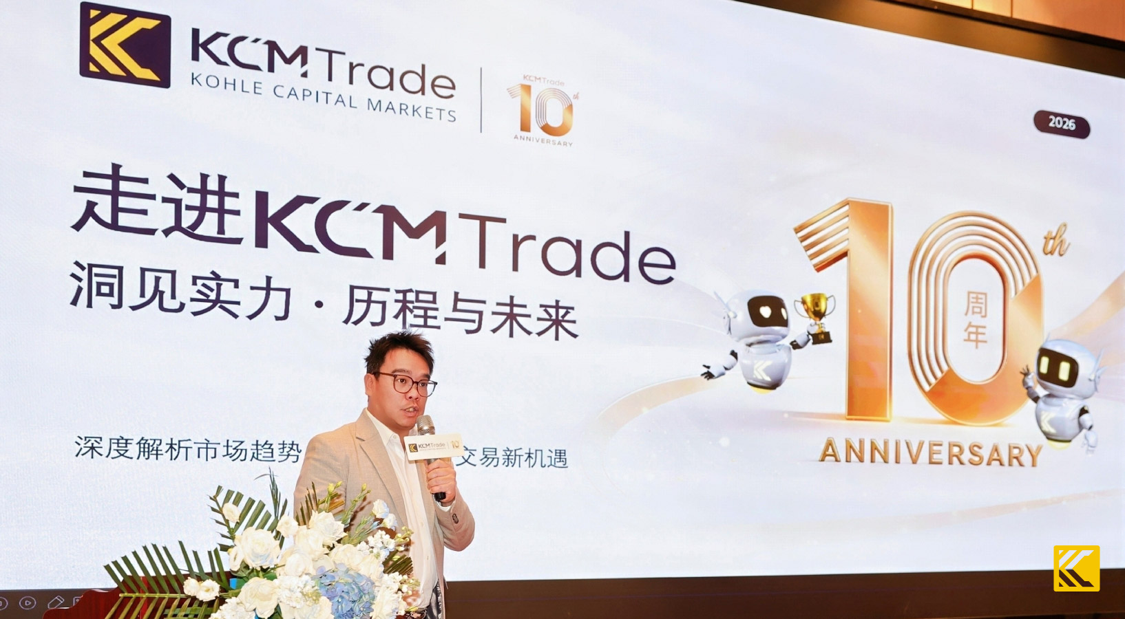 KCM Trade首席执行官Ryan随后向与会者介绍公司整体发展与品牌优势。KCM Trade成立于2016年,于2026年迎来十周年的发展里程碑,是受澳大利亚证券交易委员会和毛里求斯金融服务委员会双重监管的差价合约经纪商。KCM Trade向交易者提供涵盖差价合约、贵金属等多元交易产品,以低点差满足多样化需求,并提供如KCM Trade行情宝等多样化的增值服务。
