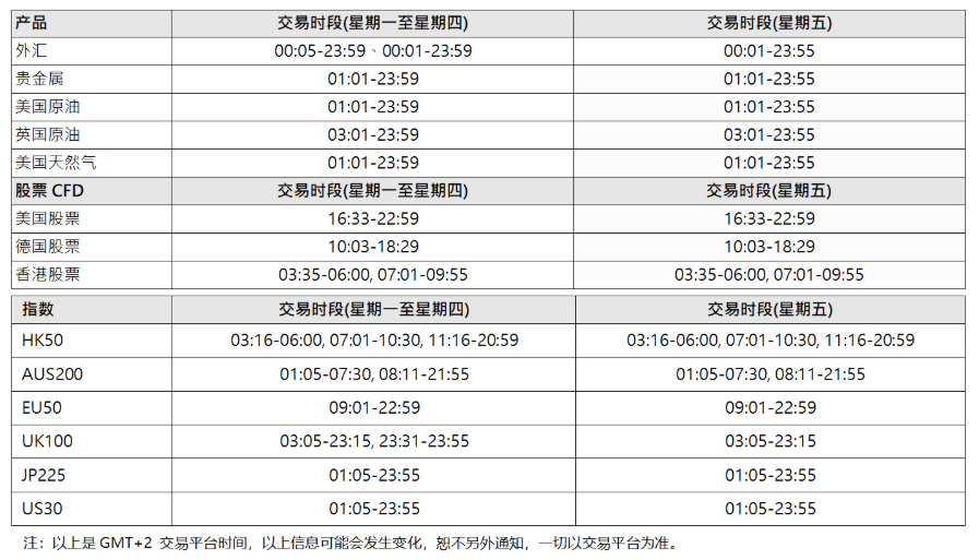 此外,由于美国将于2025年11月2日(星期日)实施冬令时,由2025年11月3日(星期一)开始,MT4/MT5服务器时间区将由GMT+3更改为GMT+2。服务器时间区的变更不会影响客户的交易单,冬令时的产品交易时间请如下。