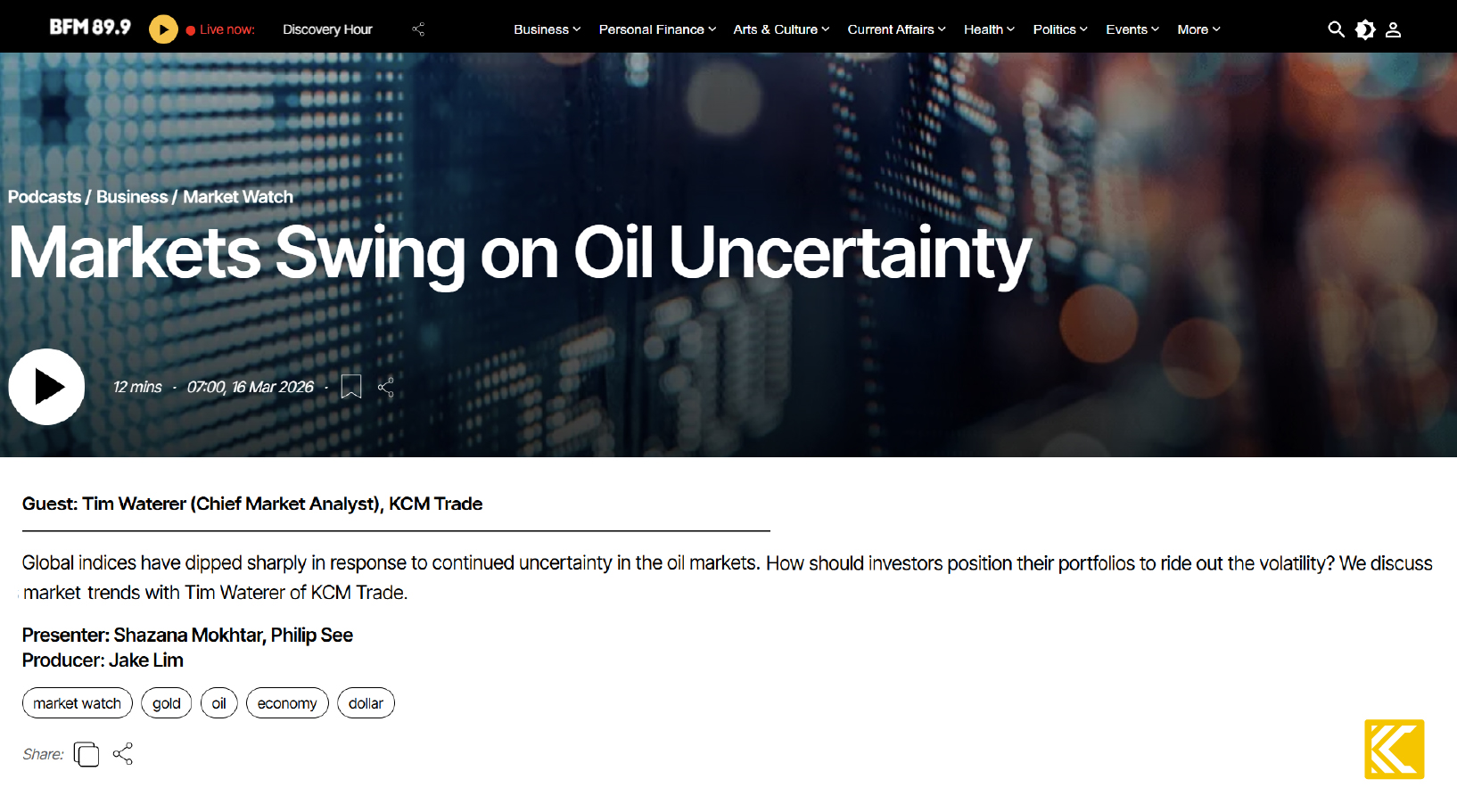 3月期间,KCM Trade 首席市场分析师兼福布斯顾问委员会成员 Tim Waterer,在多家国际主流媒体上分享了他的市场见解,包括 RTHK Radio 3、TRT World、BFM 89.9、Ausbiz 以及 Sky News。